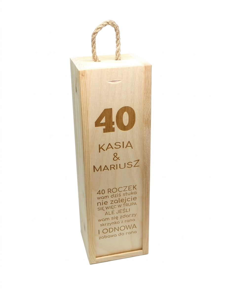 Podaj informacje, jakie mają być na skrzynce. Przykład: Pole personalizacji – proszę wstawić od góry „40 KASIA & MARIUSZ” potem na dole tekst „40 roczek wam dziś stuka nie zalejcie…” UWAGA: Istnieje możliwość wstawienia własnego Loga lub grafiki. Logo lub grafika musi być wykonana w jednym kolorze. Mamy możliwość druku w wielu kolorach lecz mogą być kolory lekko zmienione przez drewno . Jeżeli nie wiesz, czy można twoje logo lub grafikę umieścić na skrzynce, najpierw skontaktuj się z nami, aby potwierdzić możliwość umieszczenia grafiki.